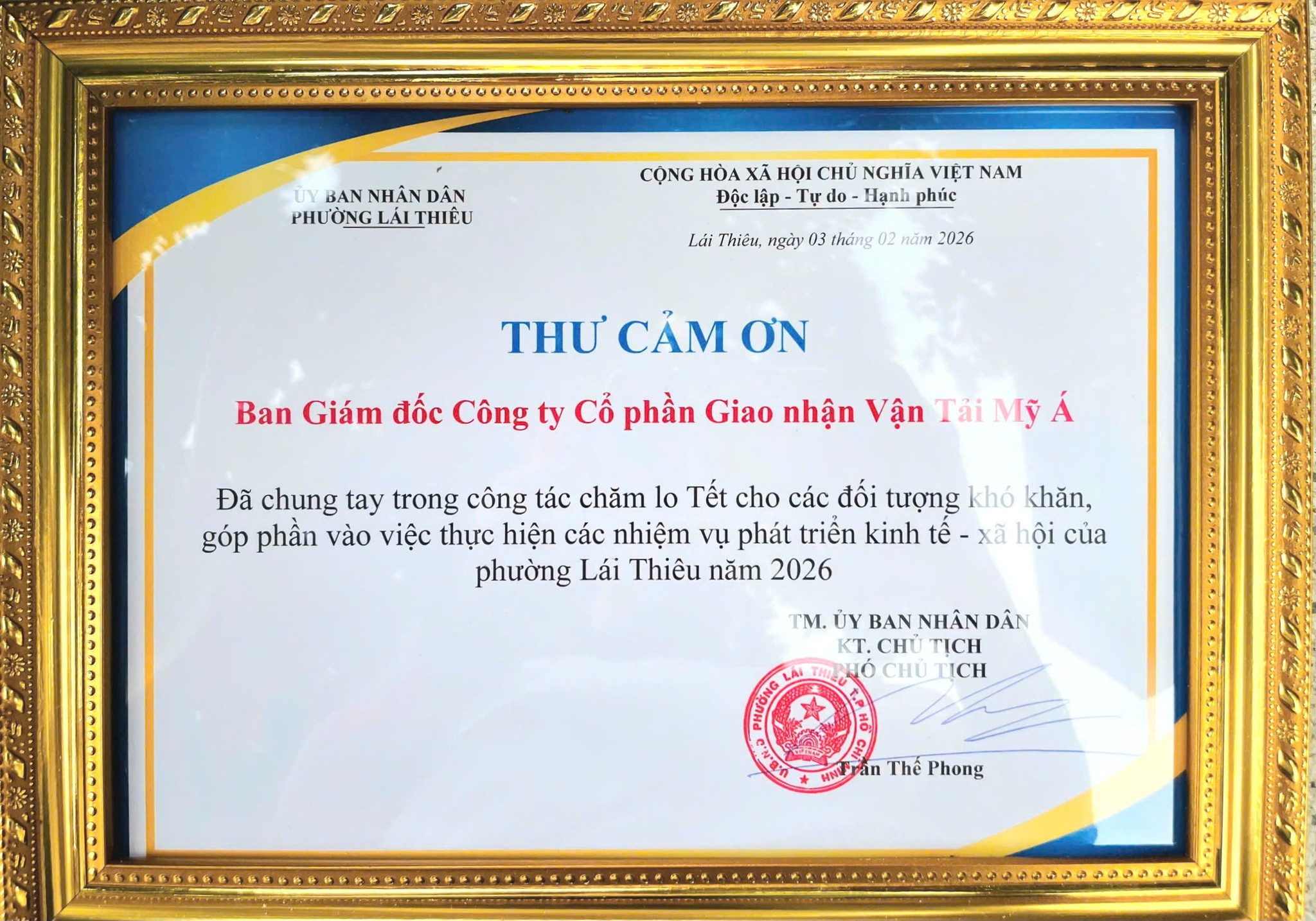 Ghi nhận và tri ân, UBND phường Lái Thiêu đã trao gửi thư cảm ơn đến ASL Logistics, bày tỏ sự trân trọng trước tinh thần chung tay chăm lo Tết cho các đối tượng khó khăn trên địa bàn, đồng thời ghi nhận đóng góp tích cực của ASL trong việc hỗ trợ thực hiện các nhiệm vụ phát triển kinh tế – xã hội của phường năm 2026. Đây không chỉ là niềm vinh dự, mà còn là nguồn động lực để ASL Logistics tiếp tục bền bỉ trên hành trình sẻ chia vì cộng đồng.