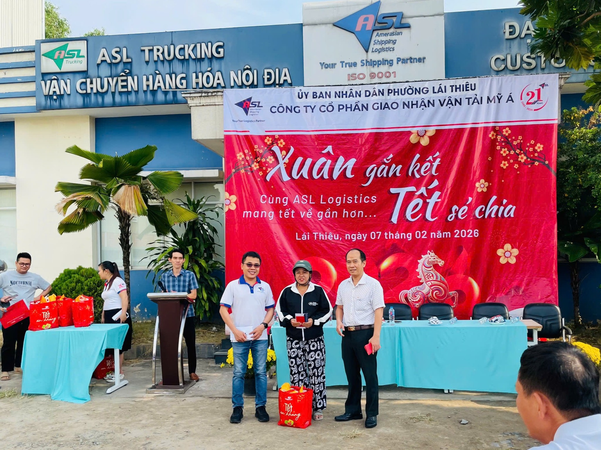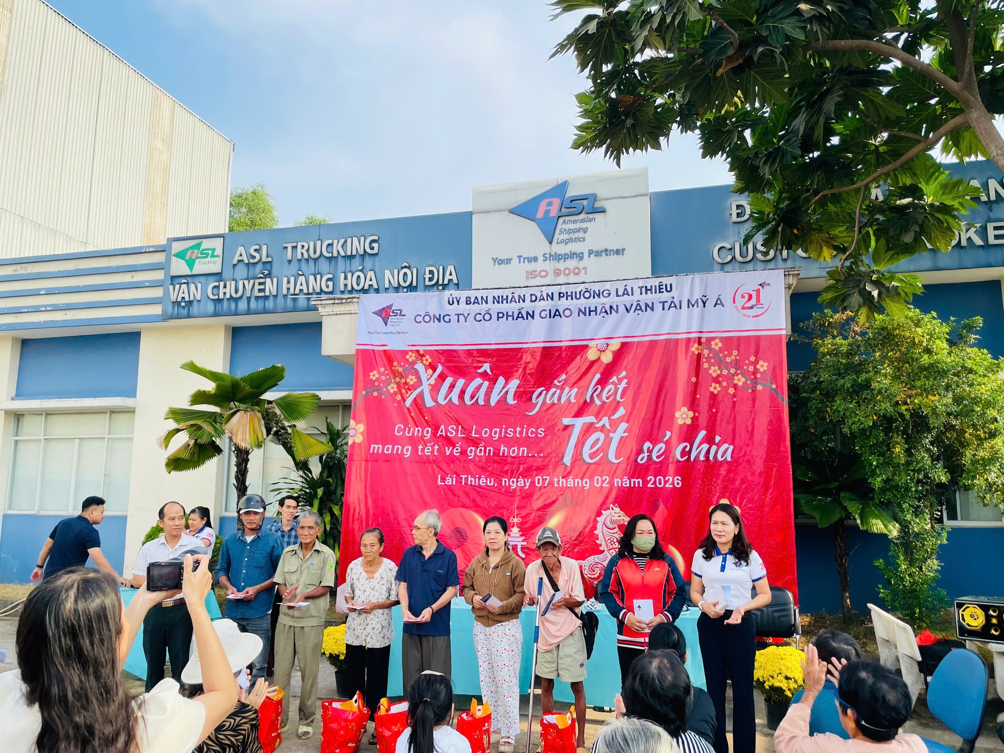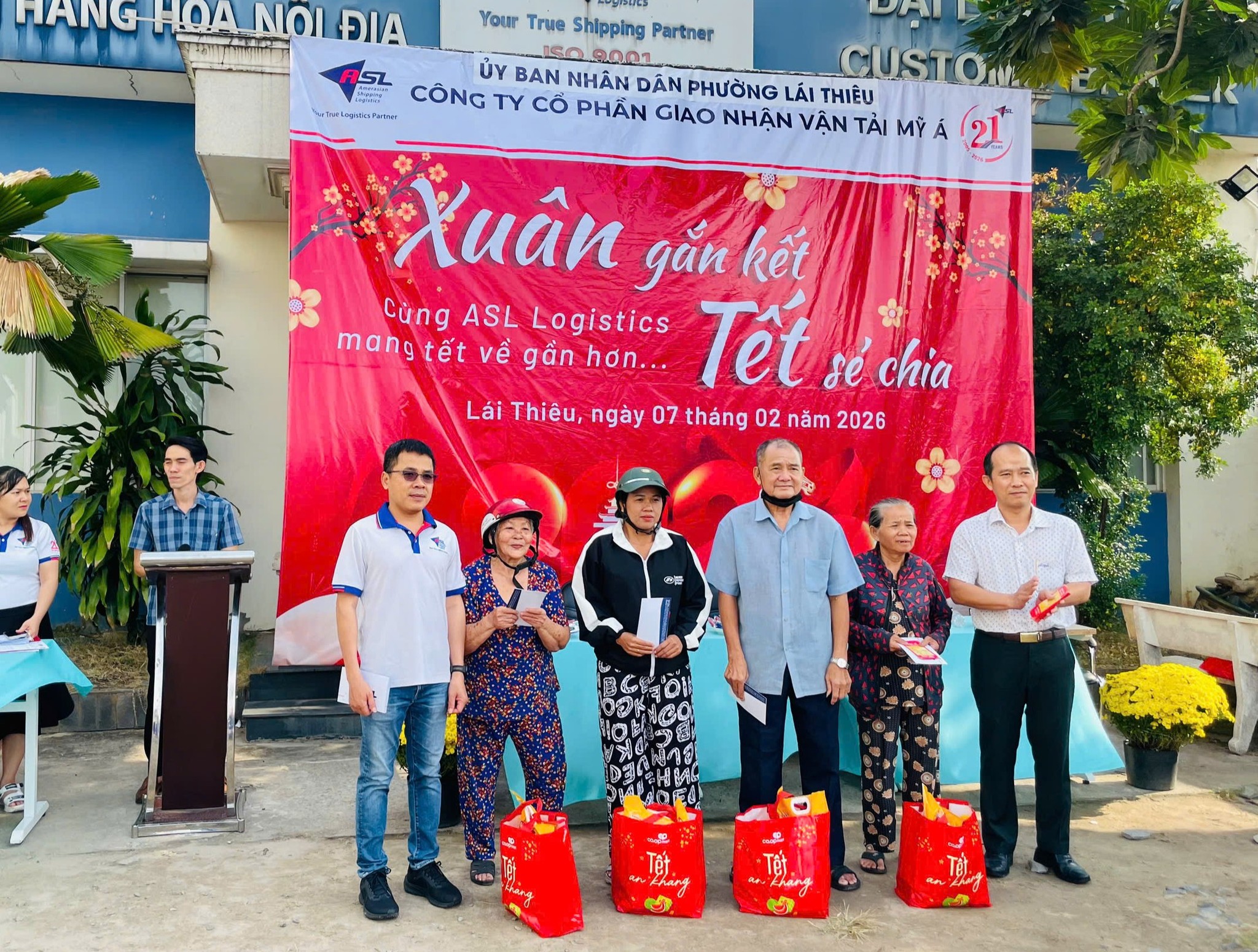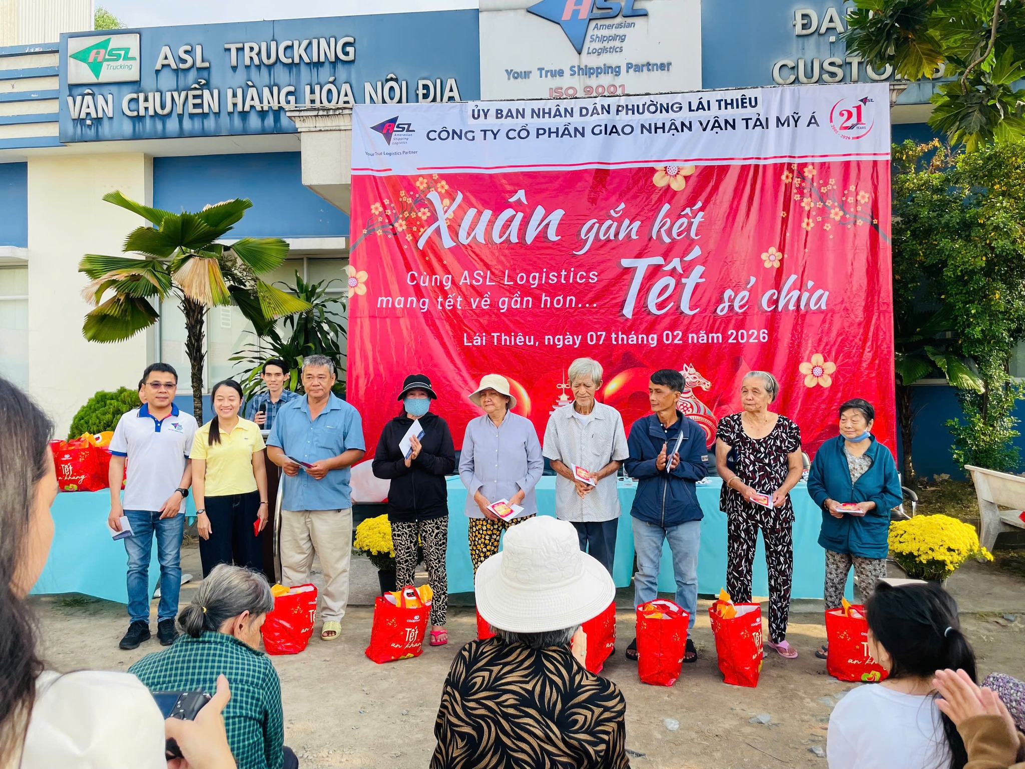 Trong không khí rộn ràng những ngày cận Tết, khi sắc xuân đang len lỏi khắp phố phường, sáng ngày 07/02/2026, ASL Logistics đã tổ chức chương trình thiện nguyện “Xuân gắn kết, Tết sẻ chia” tại Chi nhánh ASL Bình Dương (cũ), dành tặng những món quà Tết ấm áp đến bà con có hoàn cảnh khó khăn trên địa bàn phường Lái Thiêu, TP. Hồ Chí Minh.