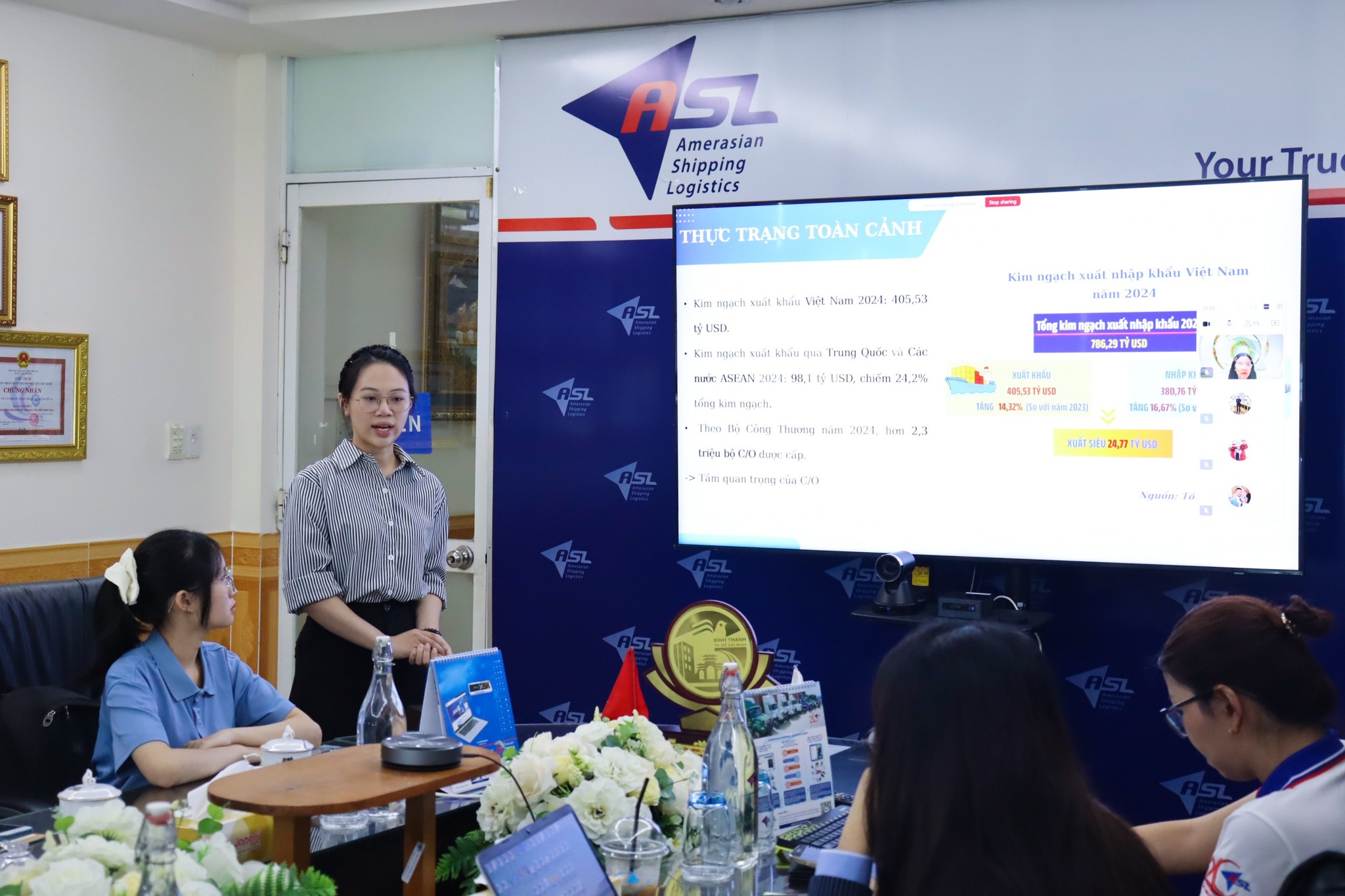 Buổi trình bày có sự tham dự của Cô Hồ Thị Thu Hòa – Phó Chủ tịch Viện Nghiên cứu và Phát triển Logistics Việt Nam và Cô Hoàng Thị Mai – Thạc sĩ, Giảng viên Trường Cao đẳng Kinh tế Đối ngoại, cùng đội ngũ lãnh đạo, quản lý ASL Logistics. Những chia sẻ chuyên môn và góc nhìn đa chiều từ các chuyên gia đã giúp đội thi hoàn thiện hơn về tính ứng dụng và định hướng phát triển đề tài.