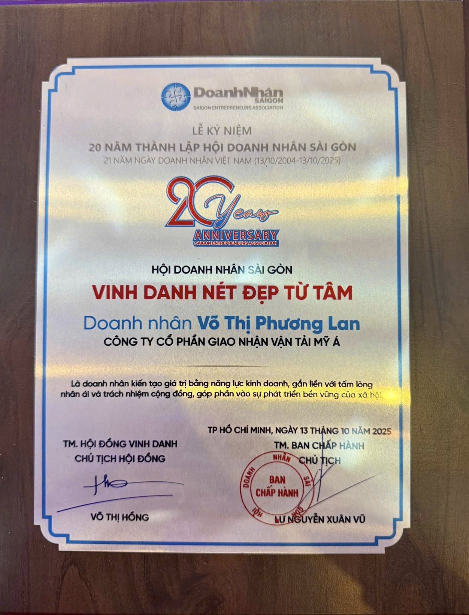 Trong khuôn khổ Lễ kỷ niệm Ngày Doanh nhân Việt Nam 13/10 và 20 năm thành lập Hội Doanh nhân Sài Gòn, bà Võ Thị Phương Lan – Tổng Giám đốc, Chủ tịch HĐQT ASL Logistics – vinh dự được xướng tên trong Top 20 “Người truyền lửa”, ghi nhận hành trình bền bỉ cống hiến, tinh thần tiên phong và những đóng góp thiết thực của bà cho sự phát triển kinh tế – xã hội, lan tỏa đổi mới sáng tạo và khẳng định hình ảnh Doanh nhân Việt trí tuệ, bản lĩnh thời kỳ hội nhập.