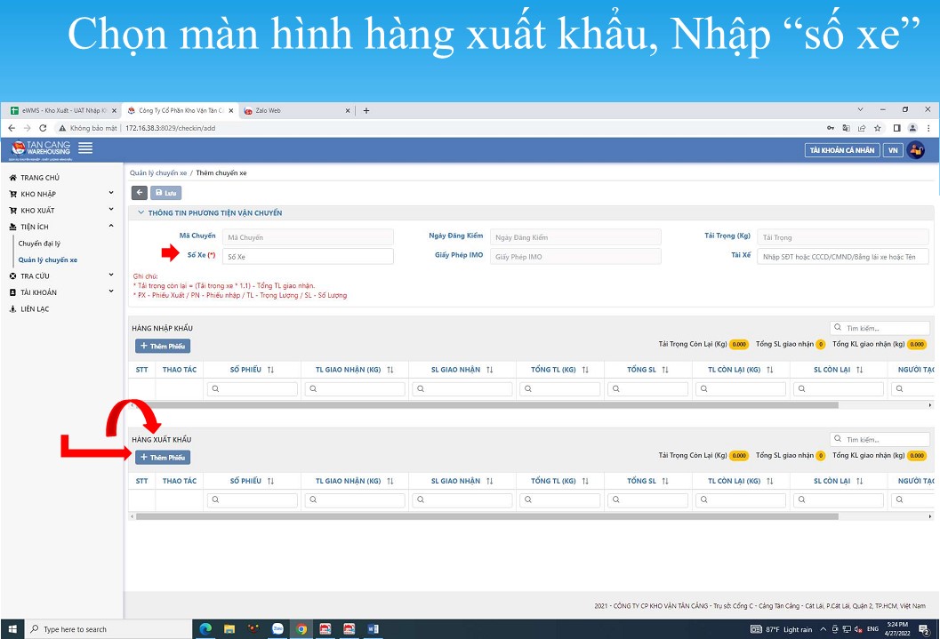 In phiếu nhập kho và phiếu tải trọng cho xe chở HÀNG XUẤT KHẨU LCL THAO TÁC TRÊN CỔNG EWMS - KHO CFS CÁT LÁI.